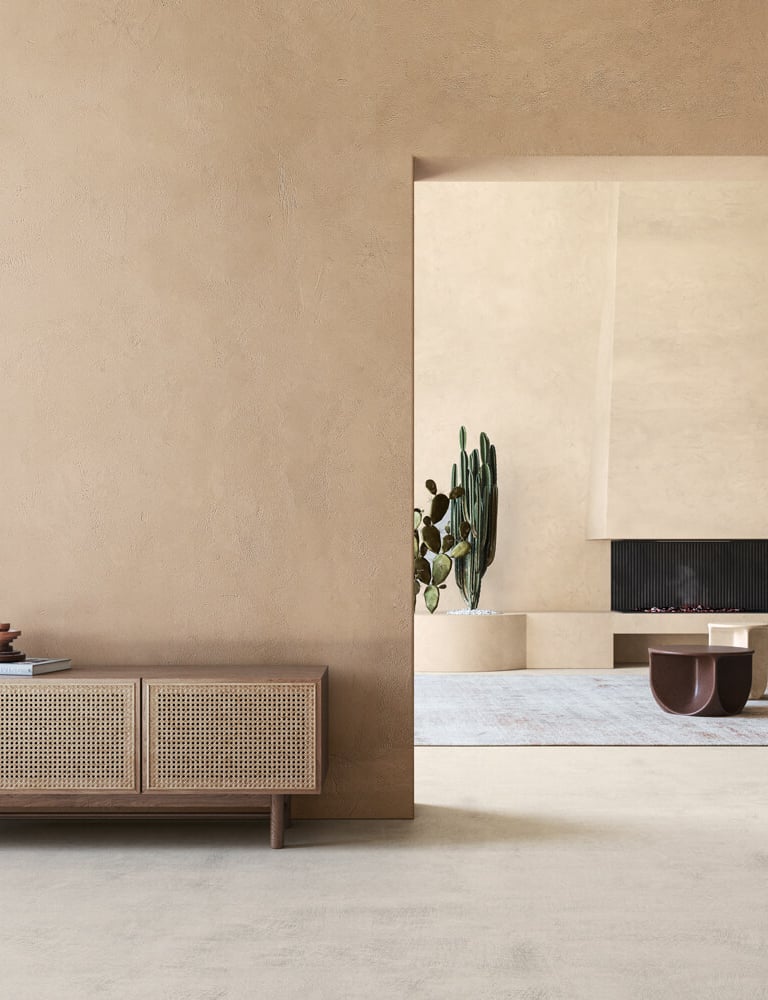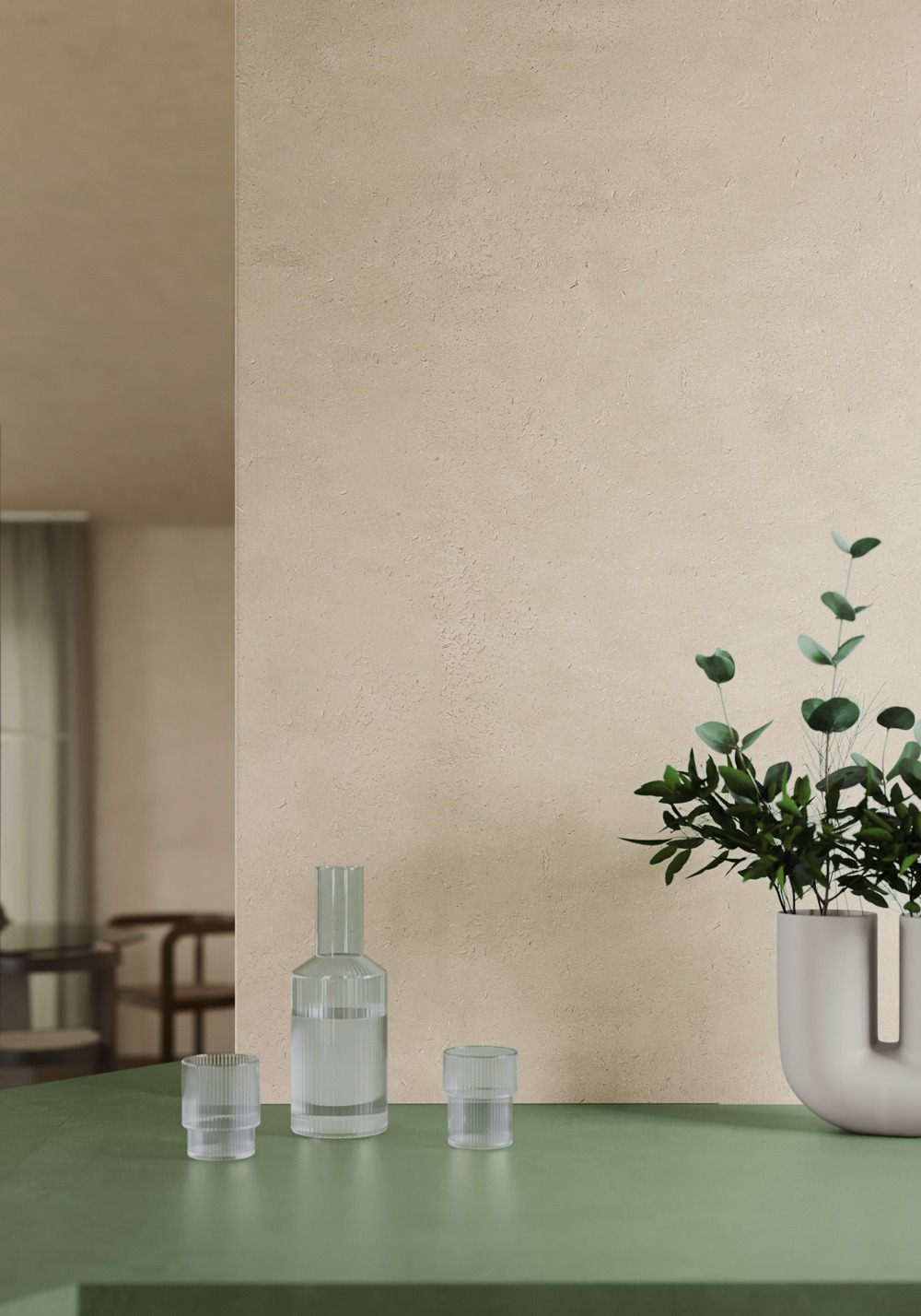 Une finition minérale saine et éco-conçue qui capture l'esthétique artisanale du sud de l'Italie, offrant une respirabilité naturelle et une faible empreinte carbone grâce à l'utilisation de chaux et de granulats recyclés.