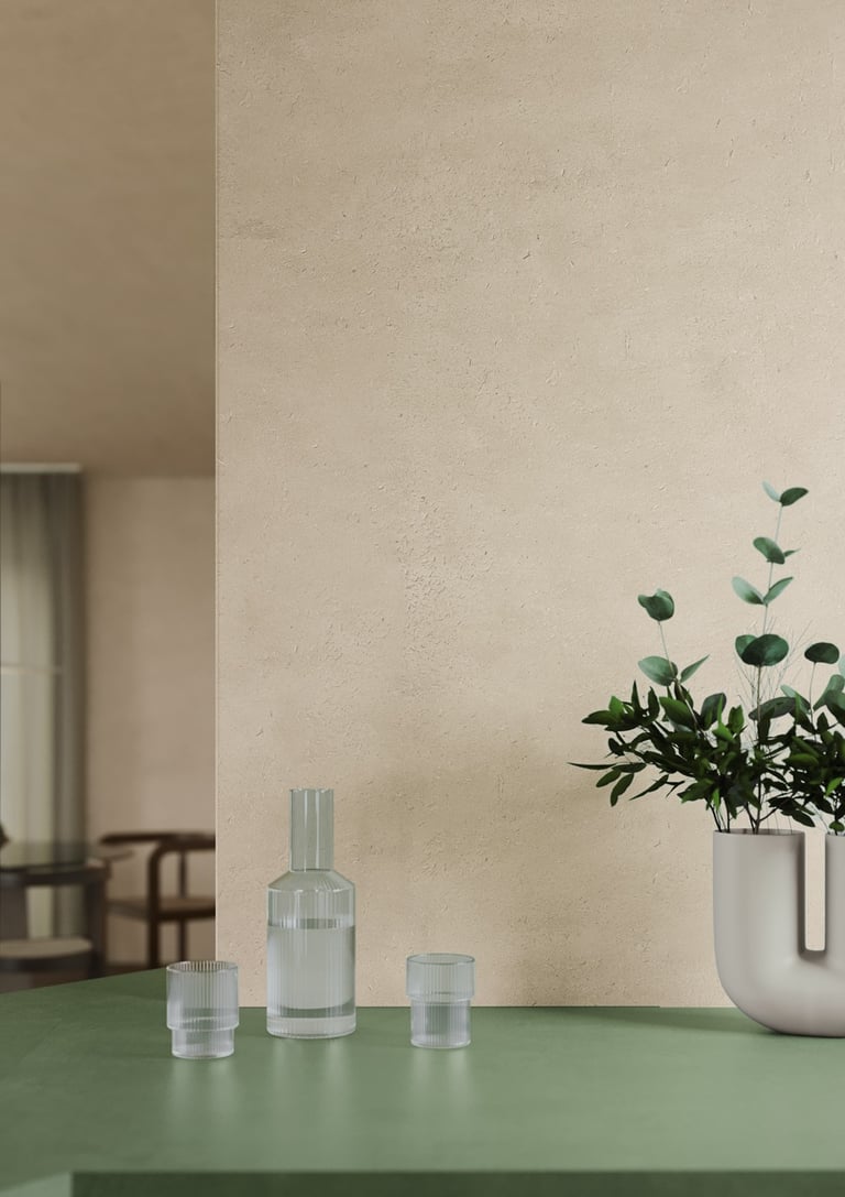 Une finition à la chaux d'une douceur extrême, évoquant l'élégance fluide de la lagune vénitienne dans un revêtement sain, éco-responsable et totalement exempt de COV.